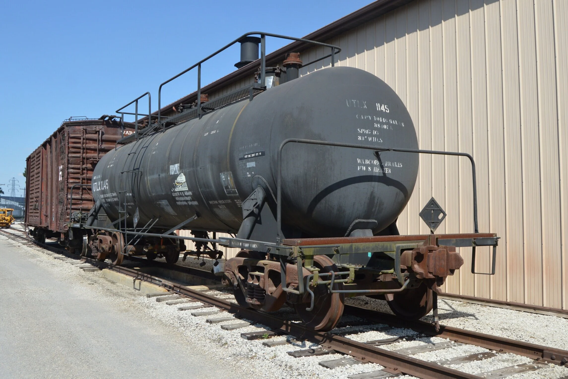 This tank car is 34 feet long with an empty weight of 18.5 tons. It was last used by the Norfolk Southern Railway in Decatur, Illinois, as a stationary sludge storage tank.